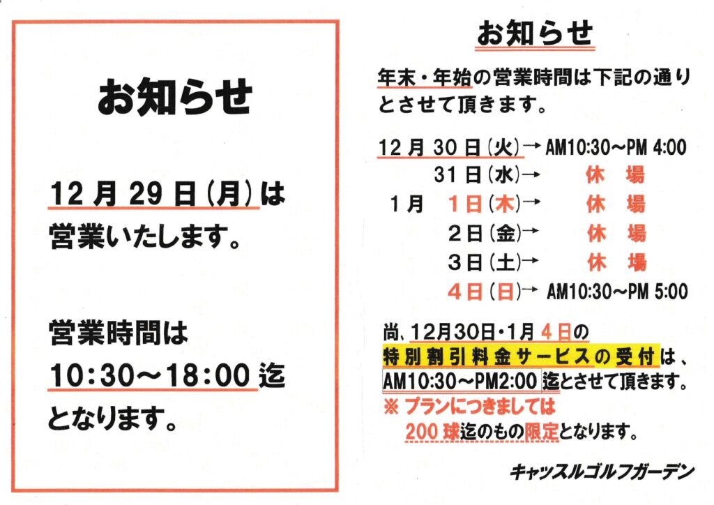 【キャッスルゴルフガーデン】年末年始・営業時間のお知らせ